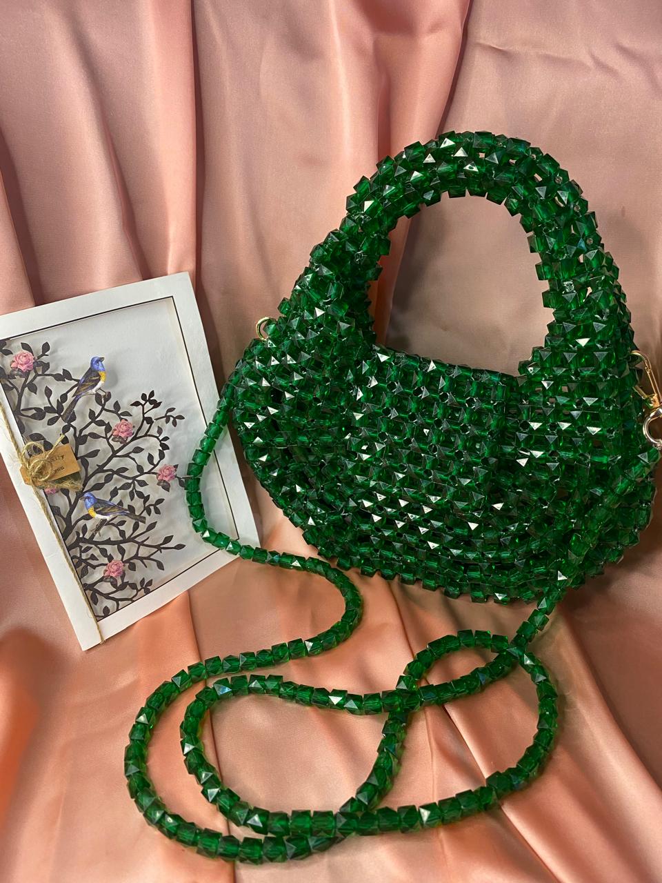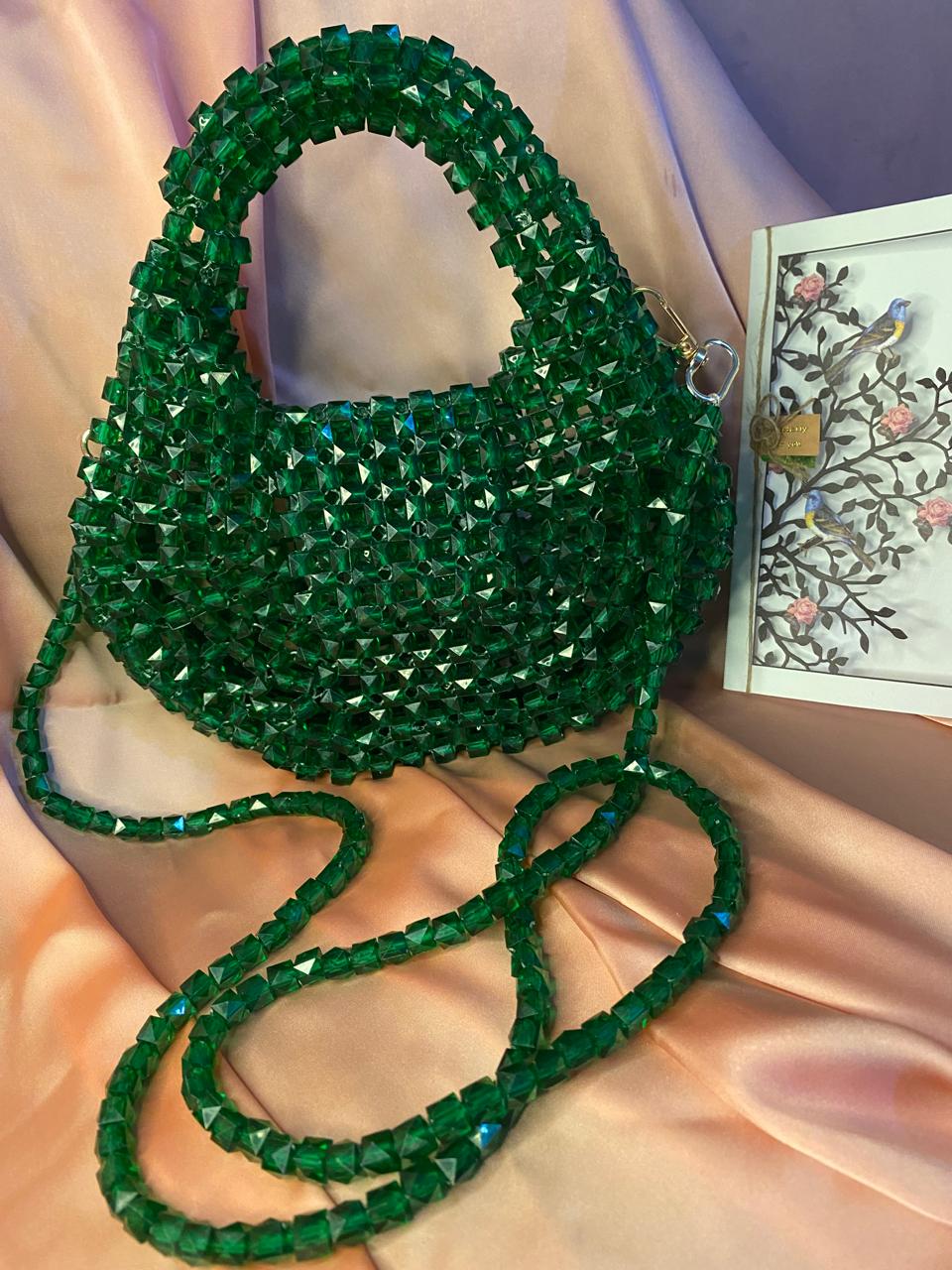 This handcrafted handbag is adorned with radiant green crystal beads, creating a dazzling shimmer with every angle. Designed with a structured silhouette and paired with a delicate silver chain, it’s the perfect accessory for weddings, formal evenings, or festive celebrations. A fusion of traditional craftsmanship and modern elegance, this purse adds timeless charm to any look.